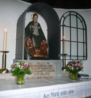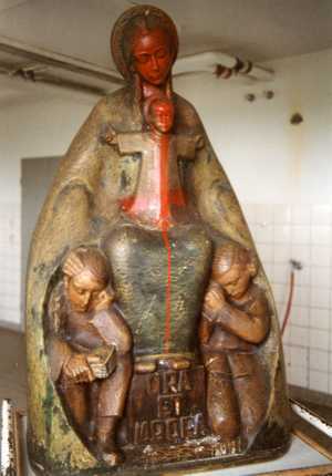 - Der Kölner Bildhauer Paul Rautzenberg schuf 1934 für die Kapelle eine schöne Schutzmantelmadonna, die auf ihrem Schoß aufrecht stehend das Jesuskind trägt und ihren Mantel über zwei Schüler breitet, von denen der eine andächtig die Hände faltet, während der andere studiert - "ora et labora" steht auf dem Schemel zu Füßen Mariens. "Unsere liebe Frau von St. Klemens - Schutzpatronin der Jugend" steht auf dem Steinsockel darunter. Auch Eduard Müller wird dieses Bild gekannt und wie alle Klementiner hier Zuflucht im Gebet gefunden und eine Kerze angezündet haben, insbesondere vor Klausuren und Prüfungen...