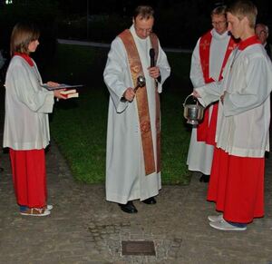 Pfr. Markus Gudermann (Mitte) segnet die neue Gedenkplatte gemeinsam mit Rektor Dr. Hohmann (r.)