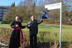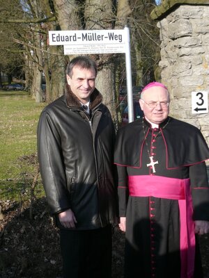 Der Rat der Stadt Bad Driburg hatte in seiner letzten Sitzung vor Weihnachten 2008 einstimmig beschlossen, dass die Straße vom Clemensheim hinauf zur Waldkapelle in Bad Driburg in "Eduard-Müller-Weg" umgewidmet werden soll. Deshalb begaben sich im Anschluss an die Feierstunde alle geladenen Gäste zum Clemensheim, um die Umwidmung vorzunehmen.