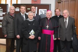 Bei der Ausstellungseröffnung im Rathaus Bad Driburg, v.l.: Heinrich Brinkmöller (stellv. Bürgermeister), Burkhard Deppe (Bürgermeister), Ulrich Schulz (Vorsitzender Förderverein St. Klemens e.V.), Prof. Dr. Peter Voswinckel (Arbeitsgruppe "Lübecker Märtyrer"), Weihbischof Hubert Berenbrinker, Rektor Dr. Hohmann (Geschäftsführer Clemens-Hofbauer-Hilfswerk e.V.), Altklementiner Helmut Ruttke (verantwortlich für die Ausstellung)